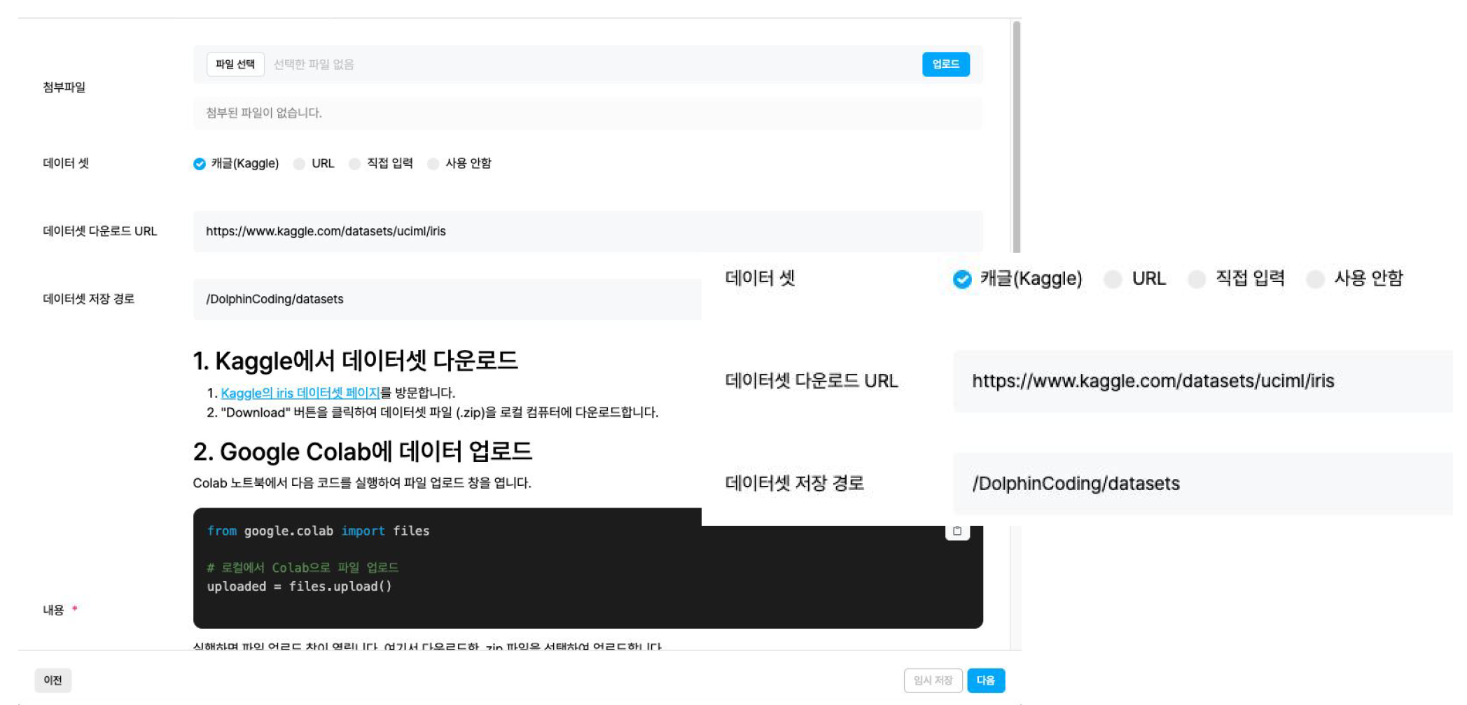 필요 시, 첨부 파일을 업로드하거나 데이터 셋을 다운받는 내용을 삽입하세요. 데이터셋 다운로드 URL, 저장 경로만 입력하면 실습 코드에 데이터셋 다운로드 코드가 자동으로 삽입돼요.