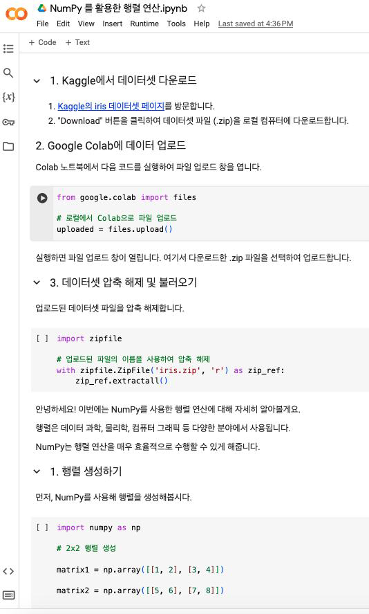 학생들이 자료를 확인하고 연동된 Google 계정으로 Colab 파일을 실행해 볼 수 있어요.