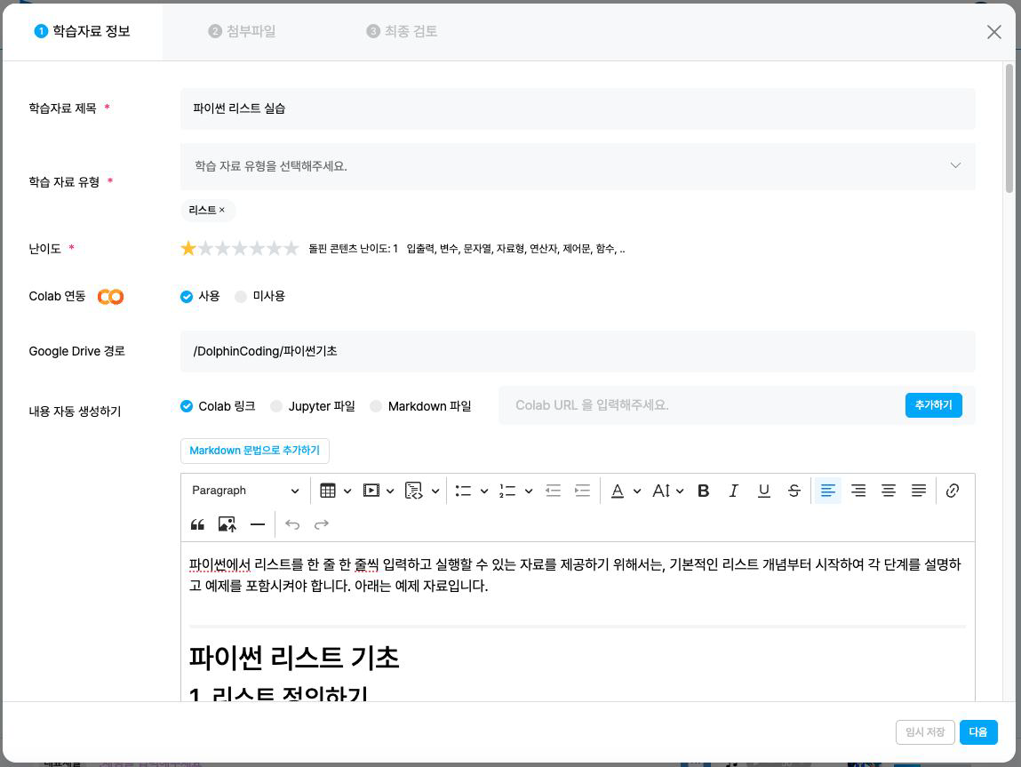 학습 자료 내용을 작성합니다. 기존에 Colab, Jupyter, Markdown 등의 자료가 있으면 내용을 자동으로 작성해 드려요!