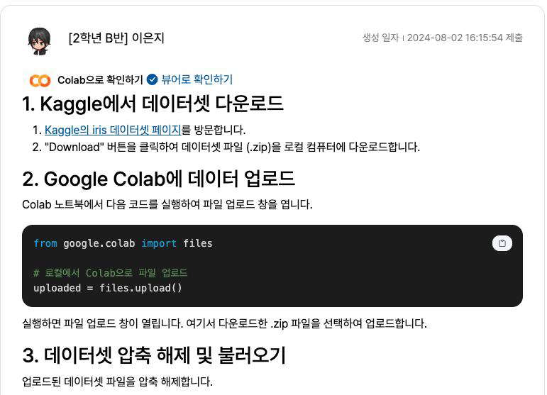 학생들이 학습 기록을 확인해보세요 학생들의 계정에 연결된 실습 기록(Colab)을 링크와 뷰어로 확인 및 편집하실 수 있어요.