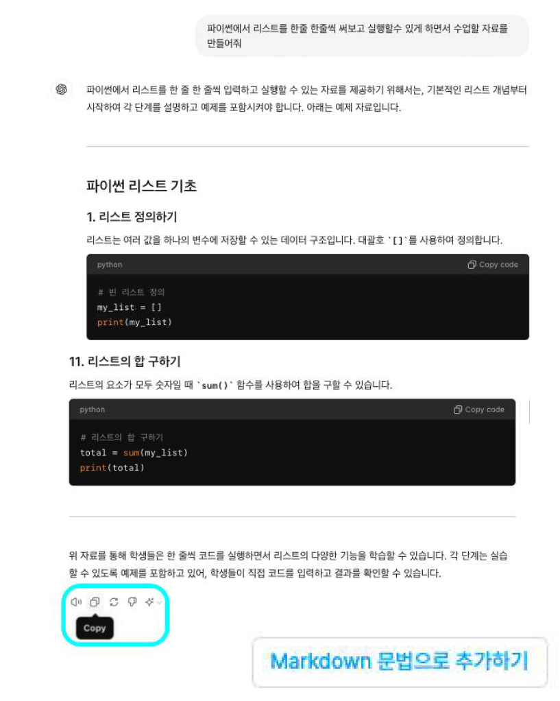 ChatGPT의 출력으로도 실습 자료를 작성하실 수 있어요! (Markdown 문법으로 추가하기)